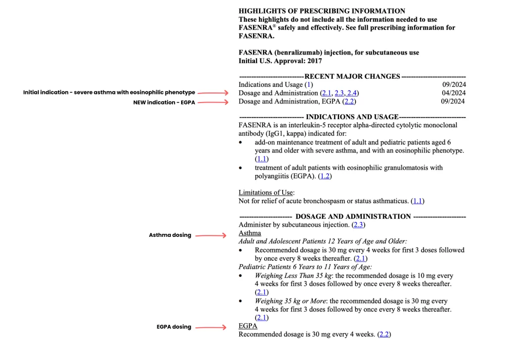 You can share this information with your doctor. On the product information sheets you will find the indication(s) (i.e. EGPA) and dosing for the indication (30 mg once every 4 weeks.